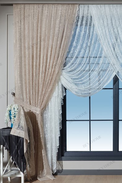 Vizon Damask Bağcıklı Tül Fon Perde Vizon